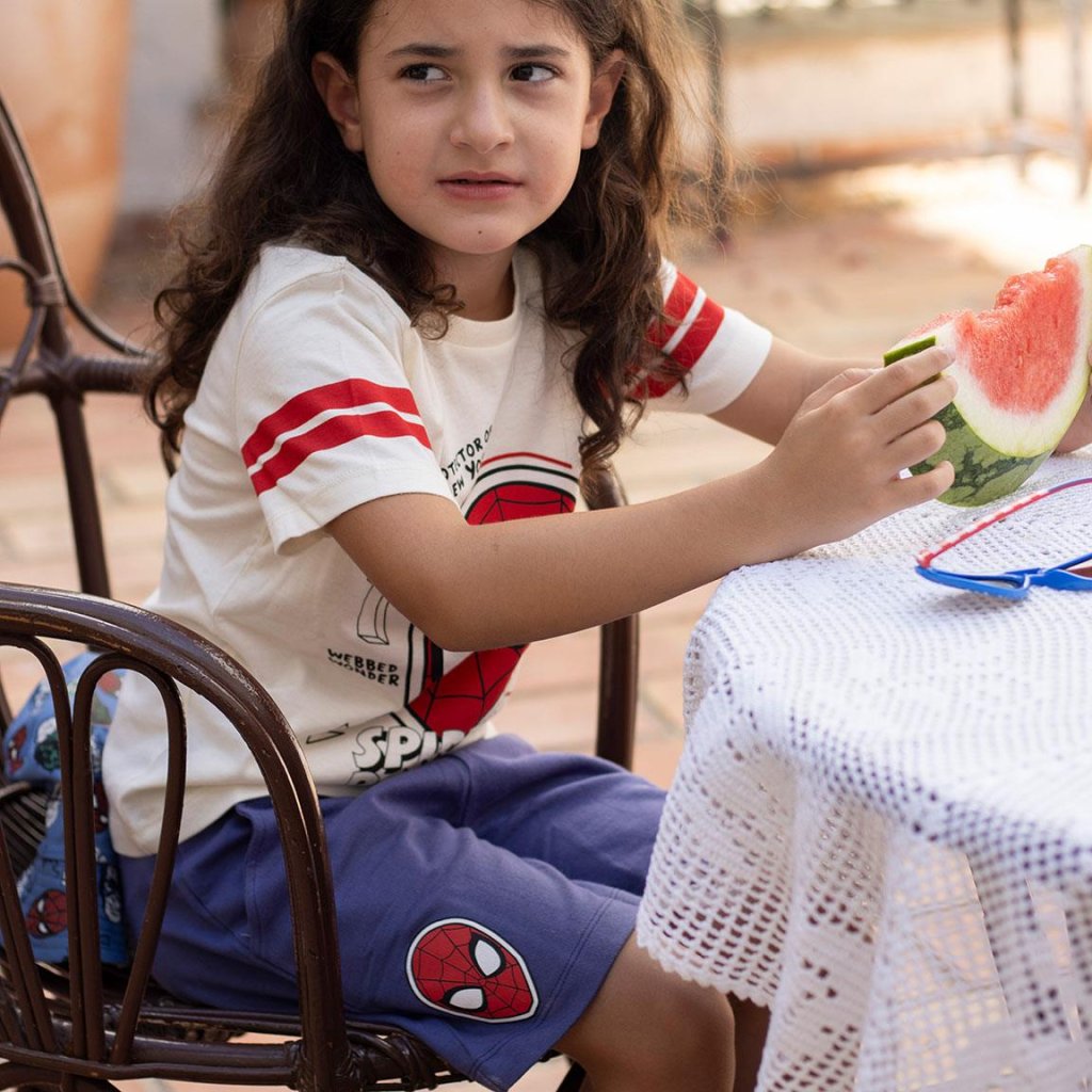 Chlapčenský letný set trička a šortiek s motívom Spidermana. Jedinečný dizajn, živé farby a veselá grafika. Pohodlný, neobmedzujúci strih.