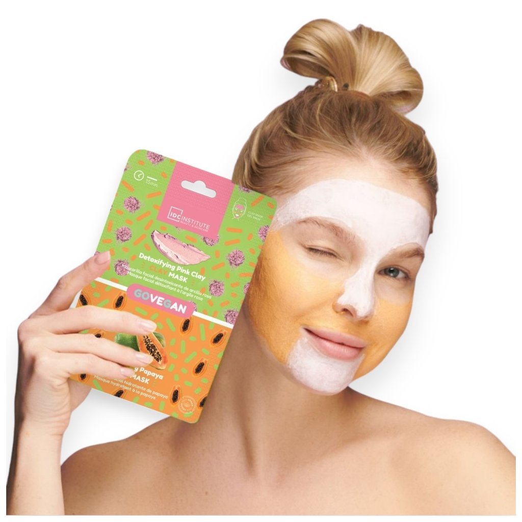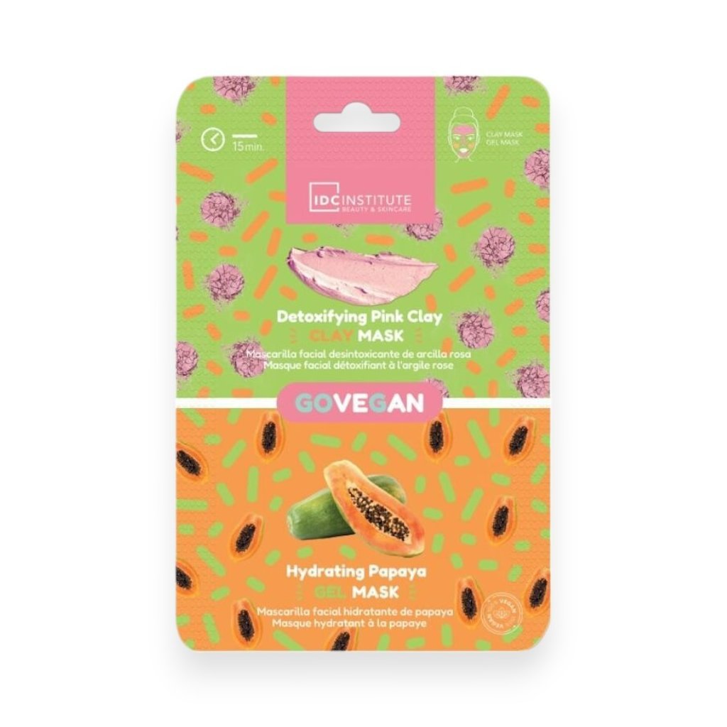 Maska s dvojitým efektom od IDC Institute je ako ušitá na mieru pre zmiešanú pleť. Prvá maska s ružovým ílom pôsobí detoxikačne, sťahuje póry, jemne odstraňuje nečistoty a prebytočný maz z T-zóny. Druhá maska, obohatená o výživnú papáju, pleť hĺbkovo hydratuje, revitalizuje a rozjasňuje. Urobte si radosť a premeňte starostlivosť o pleť na farebný zážitok!